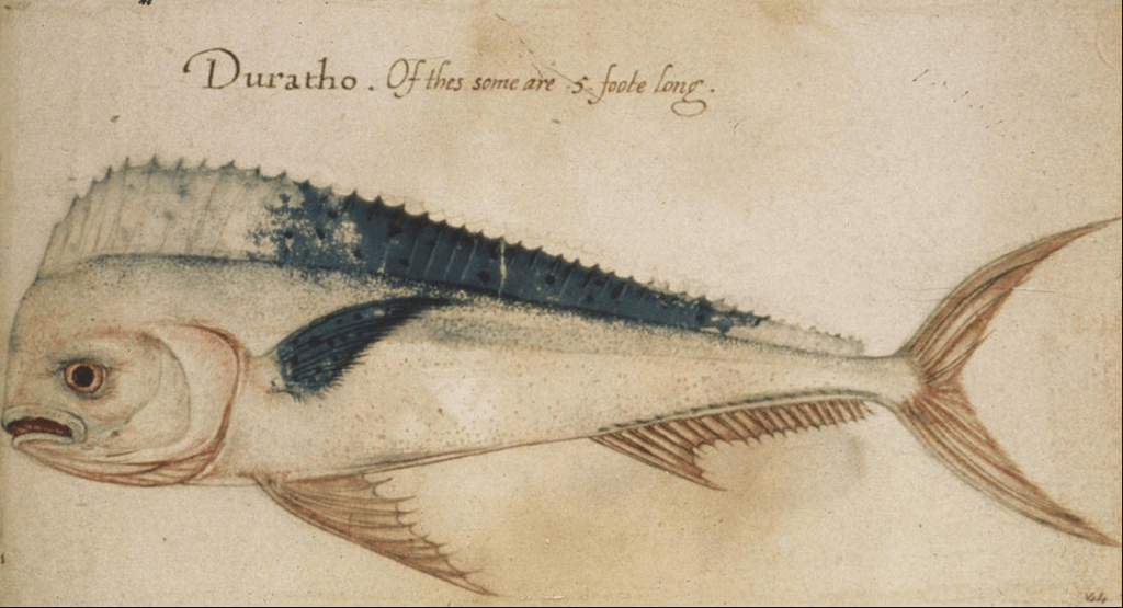 The beasts on candlesticks we refer to as a dolphin may have derived from early drawings by a Roanoke settler named John White and may actually be derived from mahi-mahi.