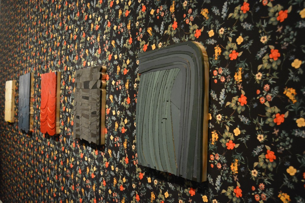 The show stopper is a large piece in primary red. Underneath are a wave of flowers taped on the wall, as if the feminine proposition of the painting isn’t apparent. The irregular linear quality takes on a different dimension. Each eggshell shaped wood block is tilted upward, just enough to be noticeable. They remind me of tiles on a roof. But under the light, that deep red is scintillating through lines of dark shadows and light gaps.
