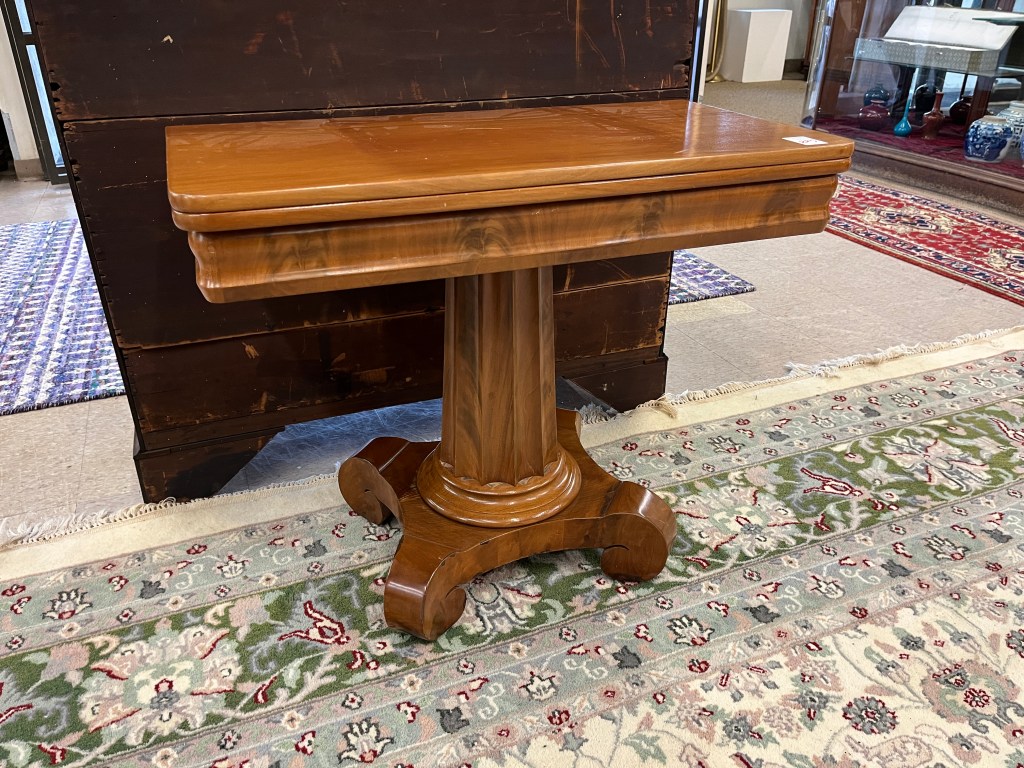 This 19th-century classical mahogany game table at O’Gallerie in Portland may have seen darker days, but the form seems hard to beat. From the discoloring on the top, it’s been on the lighter side for a while and the former owner kept it in the open position. Some lucky bidder brought it home for less than $700.