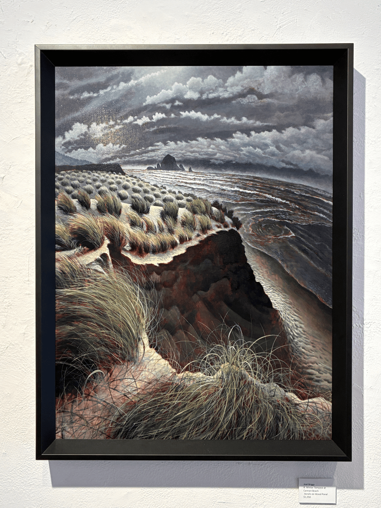 The unfamiliarity found within familiar subjects makes His Winter Tempest at Cannon Beach a standout. Even for locals, winter is typically a time to hunker down, with the seashore seen as a place to avoid—buffeted by torrential rain and chilling wind.