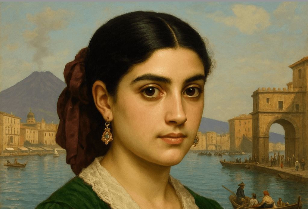 Recent AI-generated images based on Bielschowski’s “Girl in Napoli” provide a stunning example of this potential. Using advanced image generation models, these recreations have produced lifelike views of the same young woman facing the viewer directly—something the original artist never painted. One AI image even places her in a detailed background of 19th-century Naples, with the iconic silhouette of Mount Vesuvius rising in the distance and bustling city life unfolding on the waterfront.
