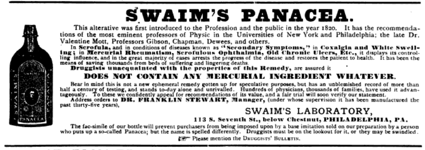 William Swaim was born in 1781 and began his career as a bookbinder in Philadelphia. Somewhere around the 1810s, he shifted from binding books to bottling remedies. He started promoting a formula he claimed could cure everything from scrofula and syphilis to rheumatism and ulcers. By the 1820s, Swaim’s Panacea was being sold across the country — in newspapers, on broadside posters, and even through physicians who endorsed it.