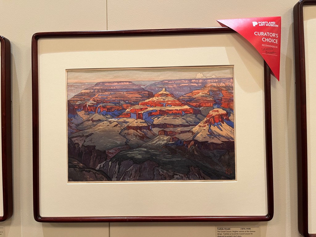 Egenolf Gallery (Burbank, CA), specialists in Japanese prints and drawings, anchored their booth with a back-wall showstopper by Yoshida Hiroshi. Anyone who recently visited the museum’s exhibition of Yoshida Chizuko will recognize the lineage: that first-ever museum presentation of Chizuko also included works by her extended family, among them Hiroshi—her father-in-law and a master of landscape woodblock prints. Like the Taj Mahal print in the museum, the Grand Canyon here dazzled with meticulous detail and striking color. The label noted that Hiroshi loved the site so much he observed and painted it for nine days. By the time we noticed it, a small blue dot—perhaps indicating a hold—had already claimed it.