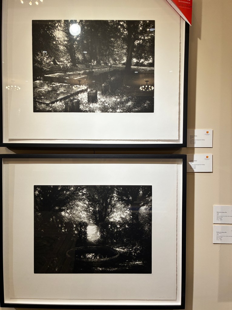 Aspinwall Editions (Hudson, NY) brought works by Stefanie Hofer, the Germany-based artist whose prints have the hush of images surfacing from another era. Two large sheets stage light and shadow with a softness reminiscent of early photography. At first glance I took them for photogravures—until a closer look revealed the hand. Hofer uses spit-bite aquatint to build a soothing darkness, almost velvety in its depth. Then, with softground etching, she captures a dreamy, lens-like blur—an analogue to bokeh—so that edges dissolve and the scene seems to breathe. The subject matter is resolutely ordinary: an urban corner that could be a forgotten graveyard or an unmarked garden. And yet, through her touch, it tips into something quietly enchanted: intimate and familiar, but also strangely peculiar.