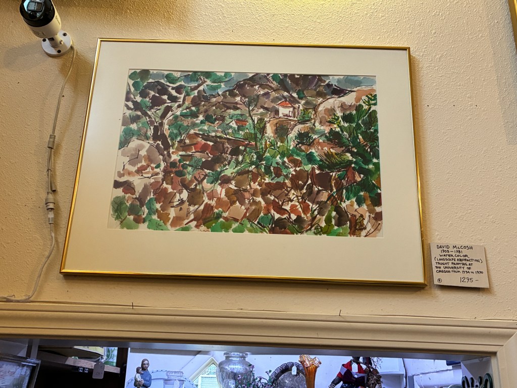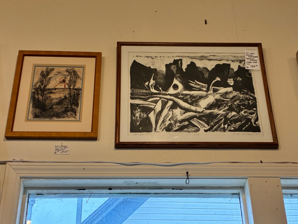 At Coburg Antiques Mall, I happened to see more artwork from Oregon artists. One watercolor painting by David McCosh (cover) is likely from the late 1950’s, during his sojourn in France. The distinct earthy, warm color palette can be found in his other watercolor paintings of that period. We brought home a litho print by Nelson Sandgren from 1982. Titled “At Bandon Beach,” (below) the artist created the print based on a watercolor painting with a similar composition. The litho, reduced to a monotonic grayscale, heightened the tension between dark rocks in the background and piled white logs in the foreground. Near the top of the print, Sangren used tushe to create a semi transparent cloud. The cloud softened the upper edge of the scene, while below it the forms stayed blunt and physical—rock, wood, weight.